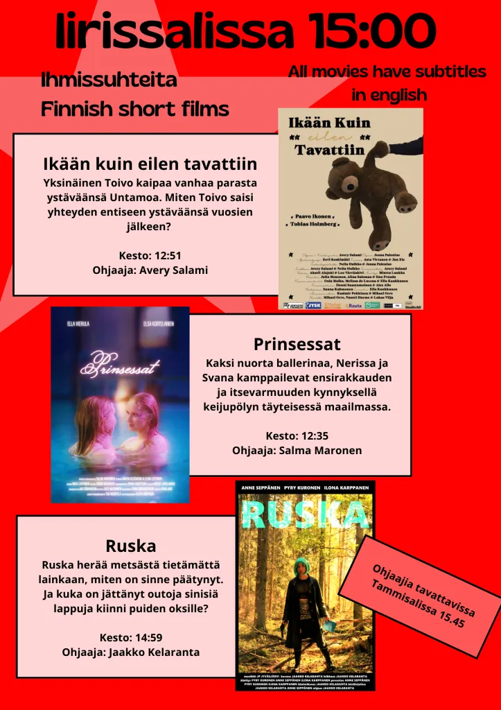 Kotimaisia lyhytelokuvia.