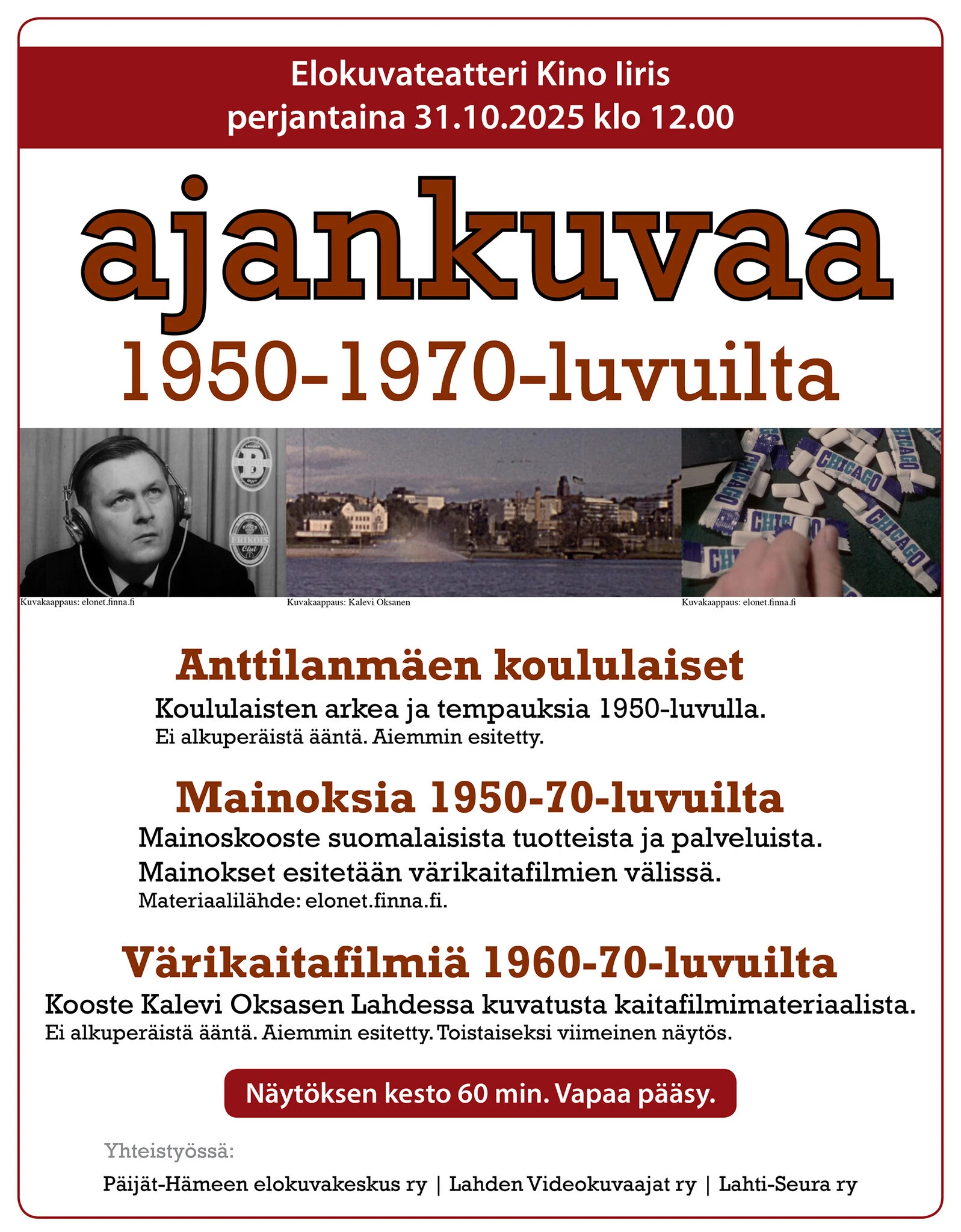 Perjantaina 31.10. klo 12 elokuvateatteri Kino Iiriksessä esitetään Ajankuvaa 1950-70-luvuilta -näytös.